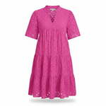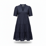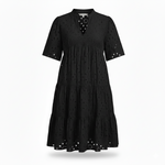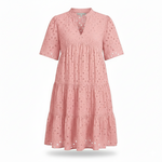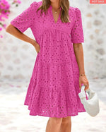 Hollow-out lace • V-neck • Short sleeves • Lined hem • Embroidery eyelet • Tiered ruffles • Flowy A-line • Mini length